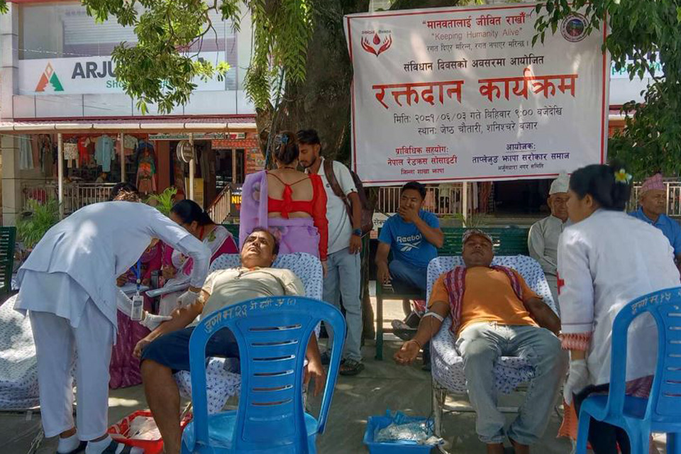 शनिश्चरे । संविधान दिवसको अवसर पारेर ताप्लेजुङ झापा सरोकार समाज अर्जुनधारा नगर समितिले नेपाल रेडक्रस सोसाइटी झापाको प्राविधिक सहयोगमा आज रक्तदान कार्यक्रमको आयोजना गरेको छ । शनिश्चरे बजारको देवकोटा चोकमा आयोजित रक्तदानमा ५ महिलासहित ३८ जनाले रक्तदान गरेका थिए ...