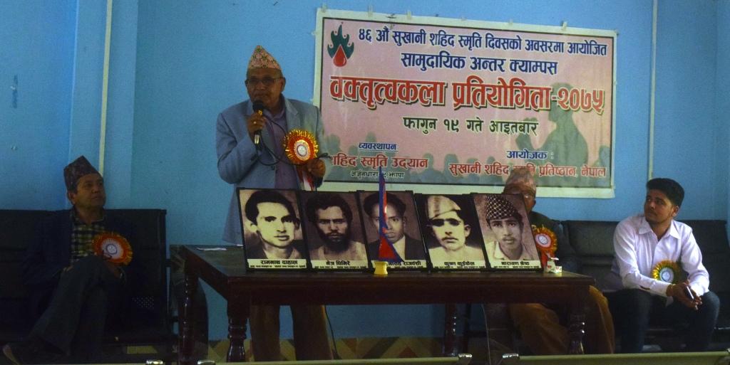 अर्जुनधारा,झापा । लक्ष्मी बहुमुखी क्याम्पस बनियानीका बादल बुढाथोकी ४६औं सुखानी शहीद दिवसको सन्दर्भमा आज सम्पन्न भएको सामुदायिक क्याम्पसस्तिरय वकतृत्वकला प्रतियोगितामा प्रथम भएका छन् । सुखानी शहीद स्मृती प्रतिष्ठान नेपालको आयोजनामा जिल्लाका १० वटा क्याम्पसको सहभागिता रहेको प्रतियोगितामा उनी ७५ अंक ...